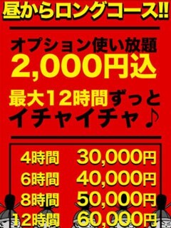 ★☆お昼からロングコース&お泊りコース☆★ 4時間 30,000円 6時間 40,000円 8時間 50,000円 12時間 60,000円 オールタイム受付可能! お昼間もロングコース承ります! お気に入りのあの子とホテルに入る前に日中デートも♪ 『お泊りコース』ではお気に入りのあの娘とゆっくり朝まで!