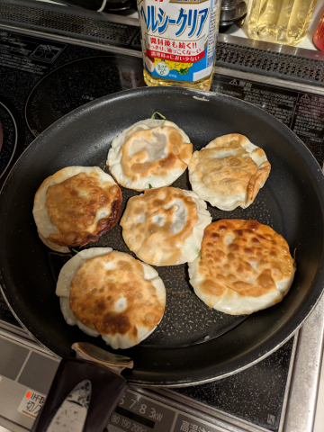 餃子の皮で鶏肉と野菜炒め、大葉、チーズ