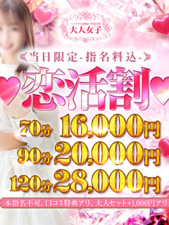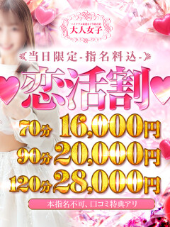 ~恋活割~ 素敵な女性との ☆ 会員様限定 ☆ 70分 16,000円 こちらの割引コースは 口コミコードを利用で ※ 当日予約限定 ※ 本指名の利用不可 ※ 予約確定後に『恋活割』への変更はできません |