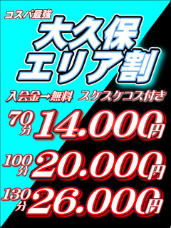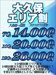 | 大久保・新大久保のホテル限定 お試しに如何ですか? 60分16.000円→70分 14.000円 一番人気コース 90分22.000円→100分 20.000円 ラグジュアリーな時間 120分28.000円→130分 26.000円 ▼△注意事項▲▽ 大久保・新大久保エリアの ホテル限定! 入会金・指名料は別途 2,000円 他店だと5,000円相当の スケスケセクシーコスチュームつき!! ※興奮度MAXでさらに楽しめます※ |